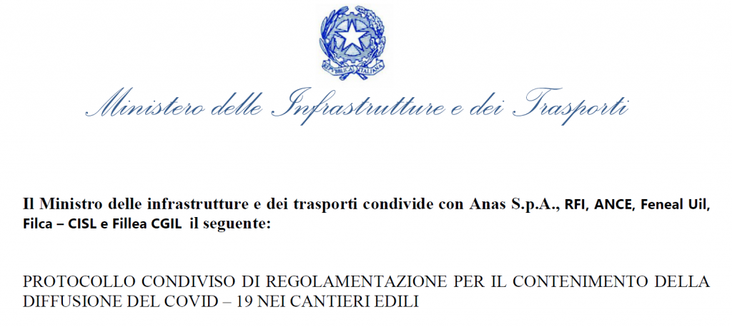 Il Ministro delle infrastrutture e dei trasporti ha elaborato un Protocollo condiviso di regolamentazione per il contenimento della diffusione del COVID – 19 nei cantieri edili