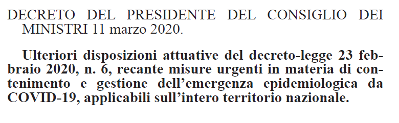 Pubblicato sulla Gazzetta Ufficiale n. 64 dell' 11 marzo 2020 il DPCM 11/03/2020 recante "Ulteriori disposizioni attuative del decreto-legge 23 febbraio